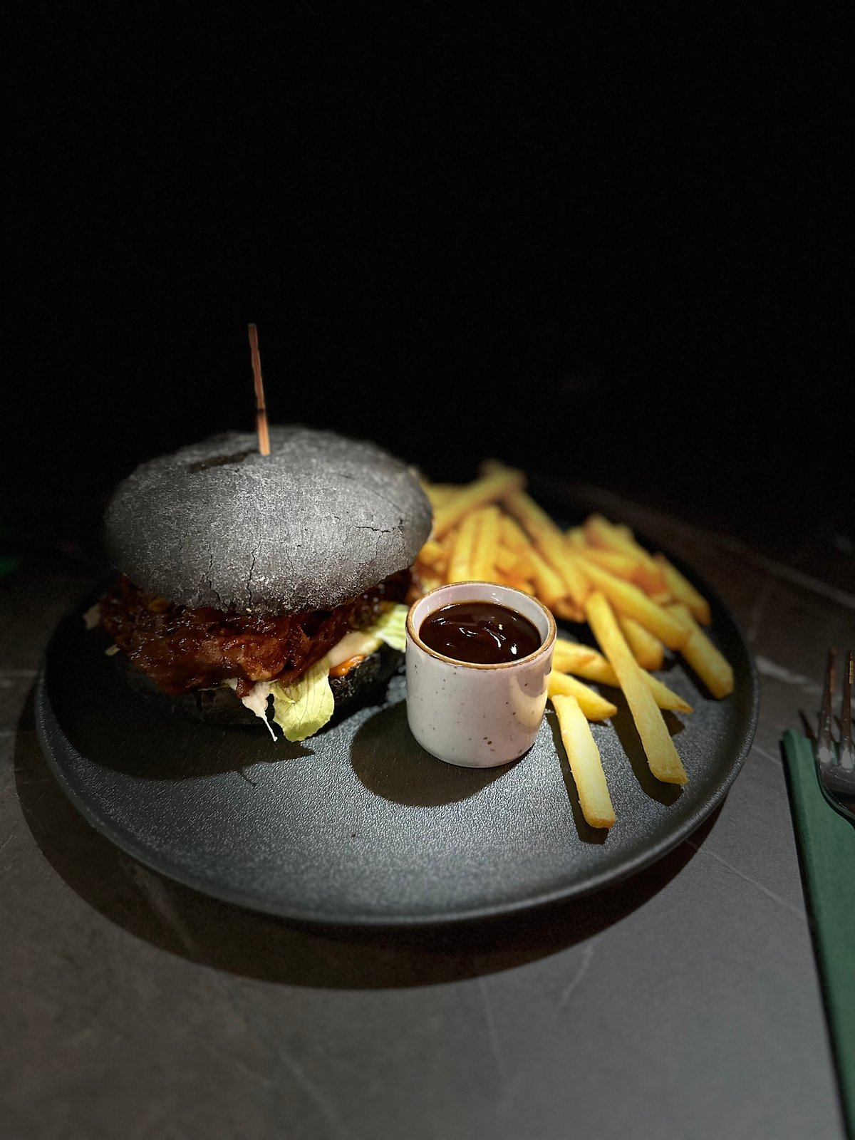 Melnais burgers ar plucinātu liellopa gaļu, karamelizētiem sīpoliem, frī kartupeļiem un BBQ mērci