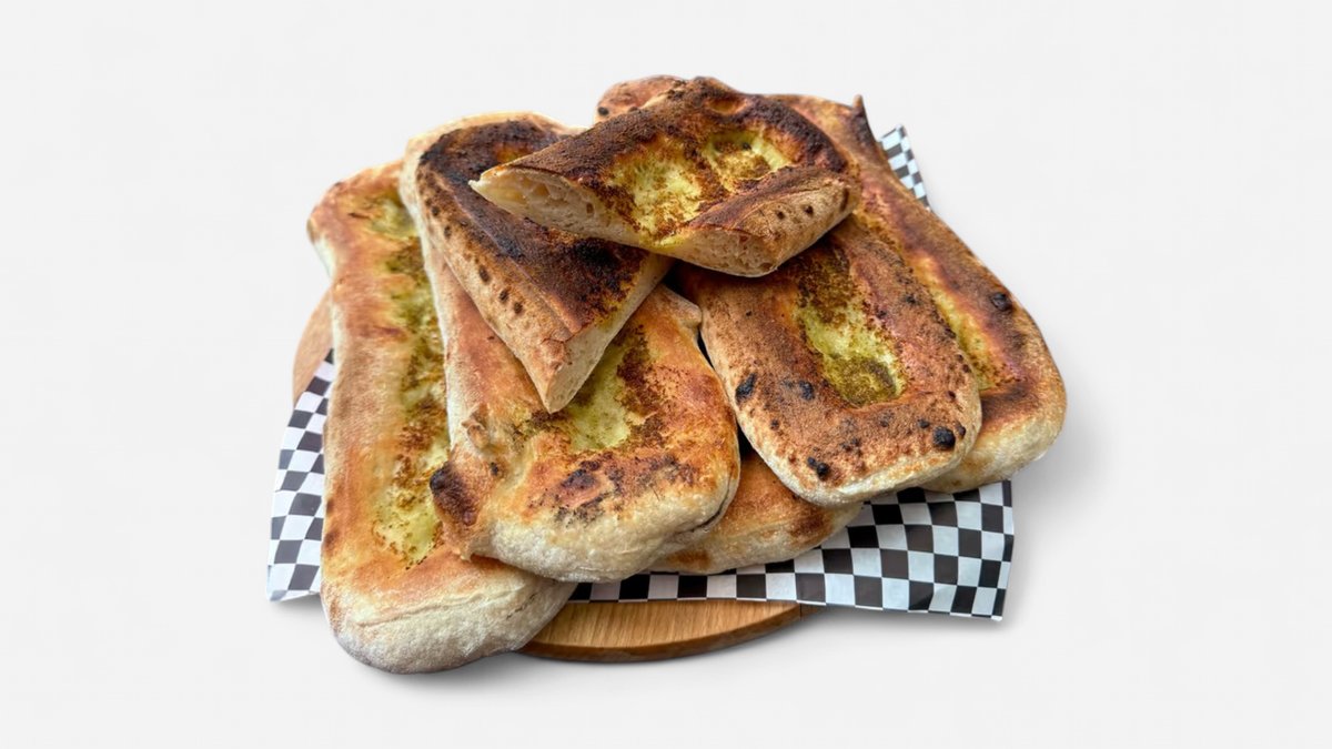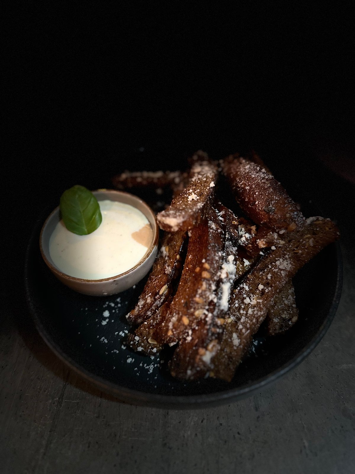 Ķiploku grauzdiņi ar bazilika-gorgonzolas siera mērci