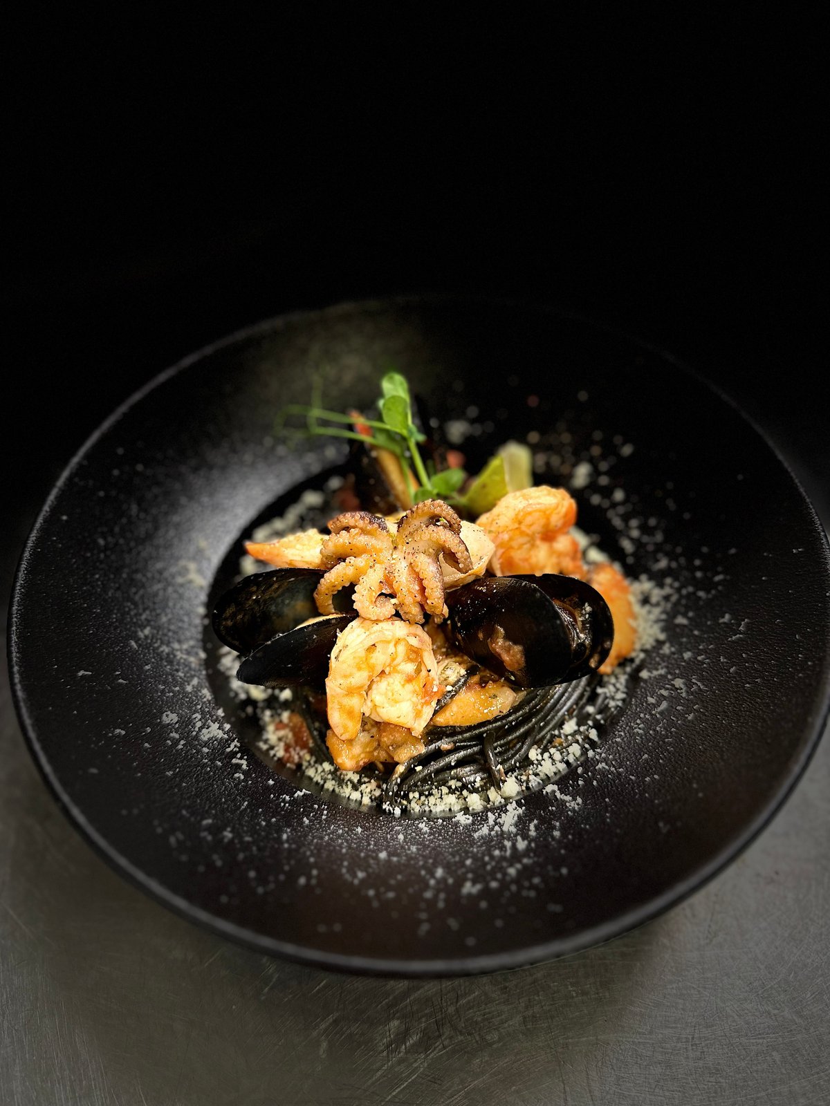 Melnie spageti,garneles,gliemenes,mīdijas,kalmāri,baby astoņkāji,kiploks,tomāti,baziliks,baltvīns,Parmigiano Reggiano