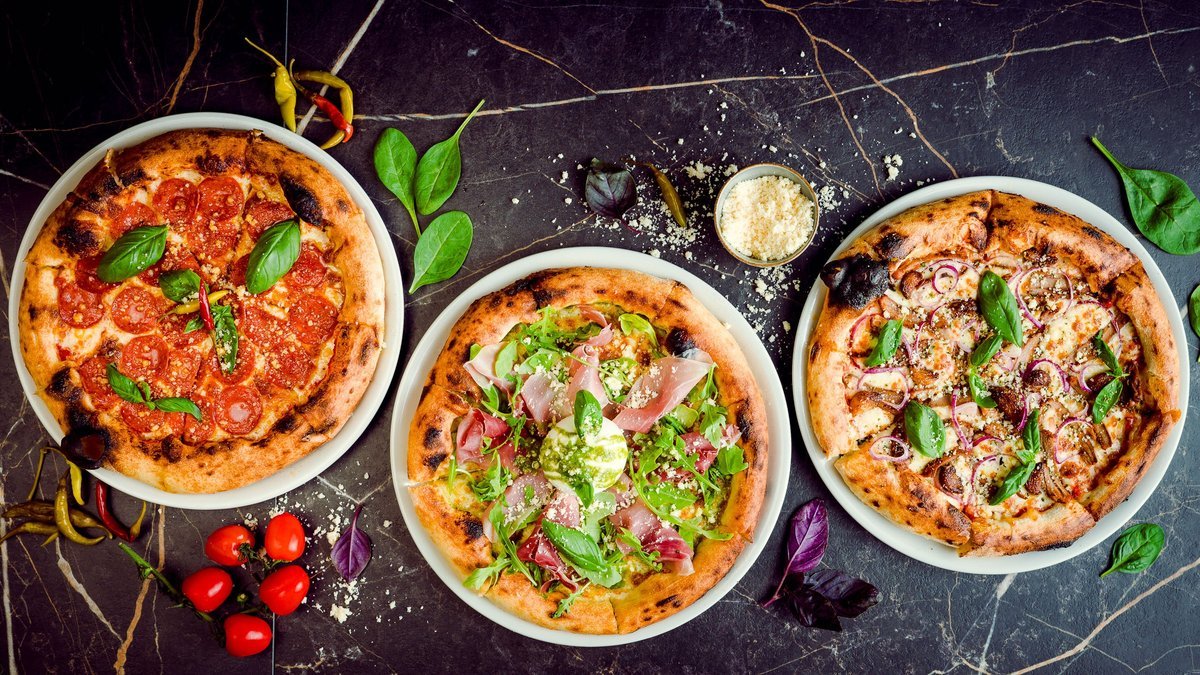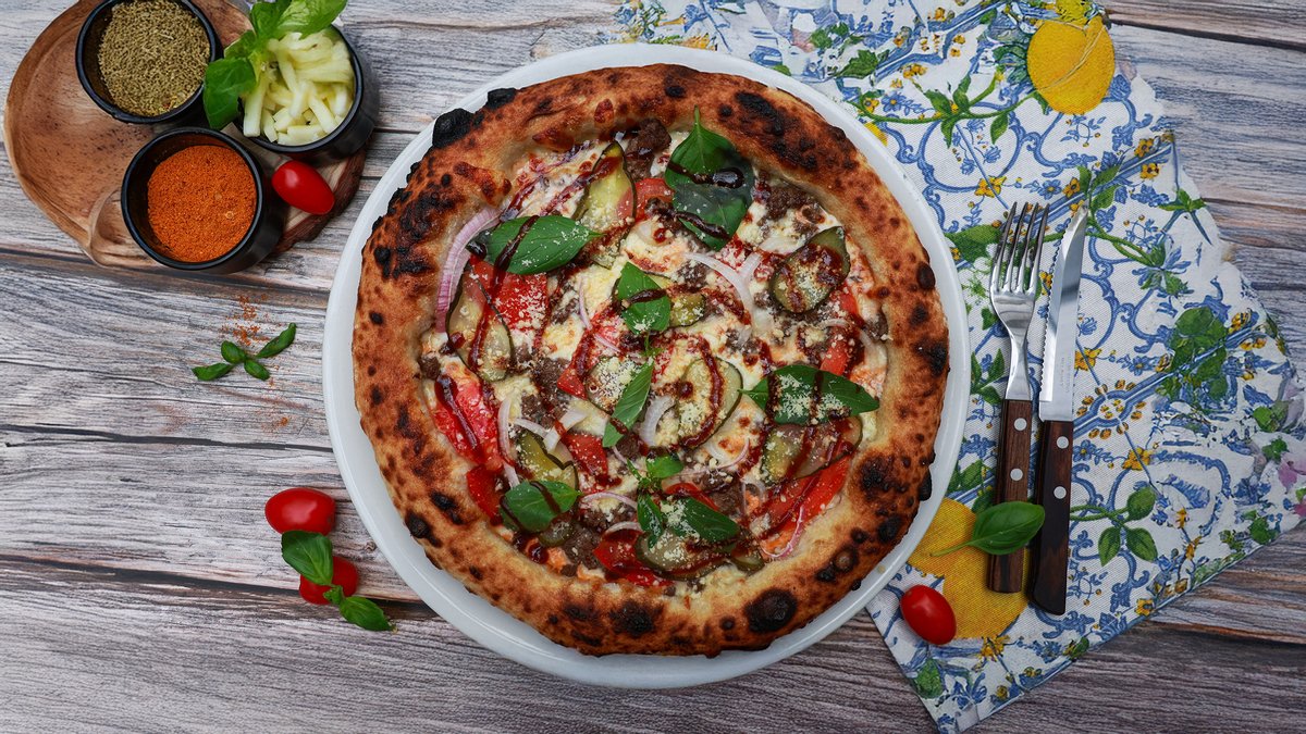 tomātu mērce, Mozzarella, liellopa maltā gaļa, bekons, karamelizēti sīpoli, tomāti, marinēti gurķi, Parmigiano Reggianao, Extra Virgin olīveļļa