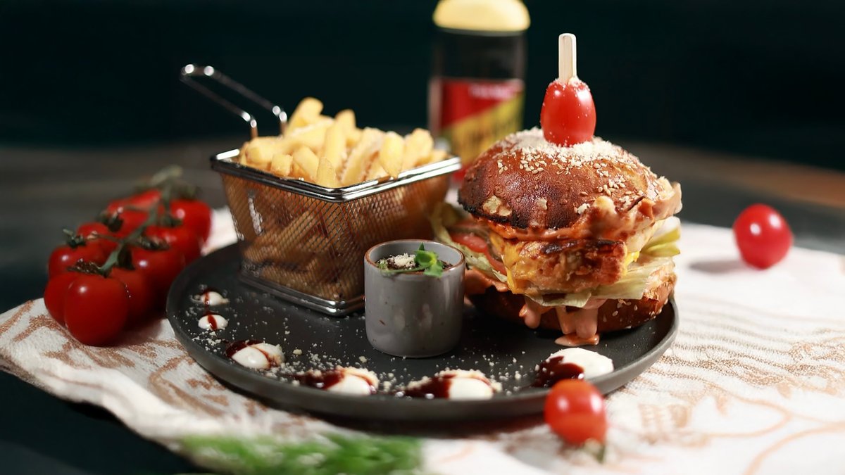 Brioche burgers ar kraukšķīgo vistu, frī kartupeļiem un BBQ mērci