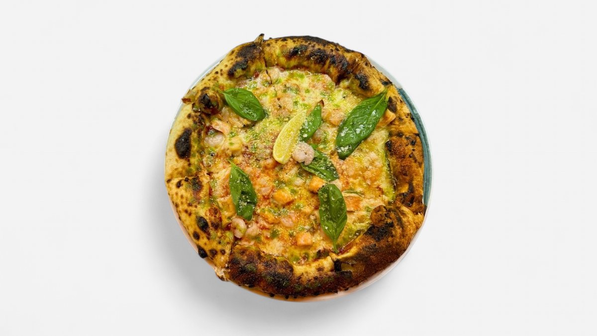 Bazilika pesto,garneles,Mocarella,Parmigiano Reggiano,baziliks,citrons,Extra Virgin olīveļļa