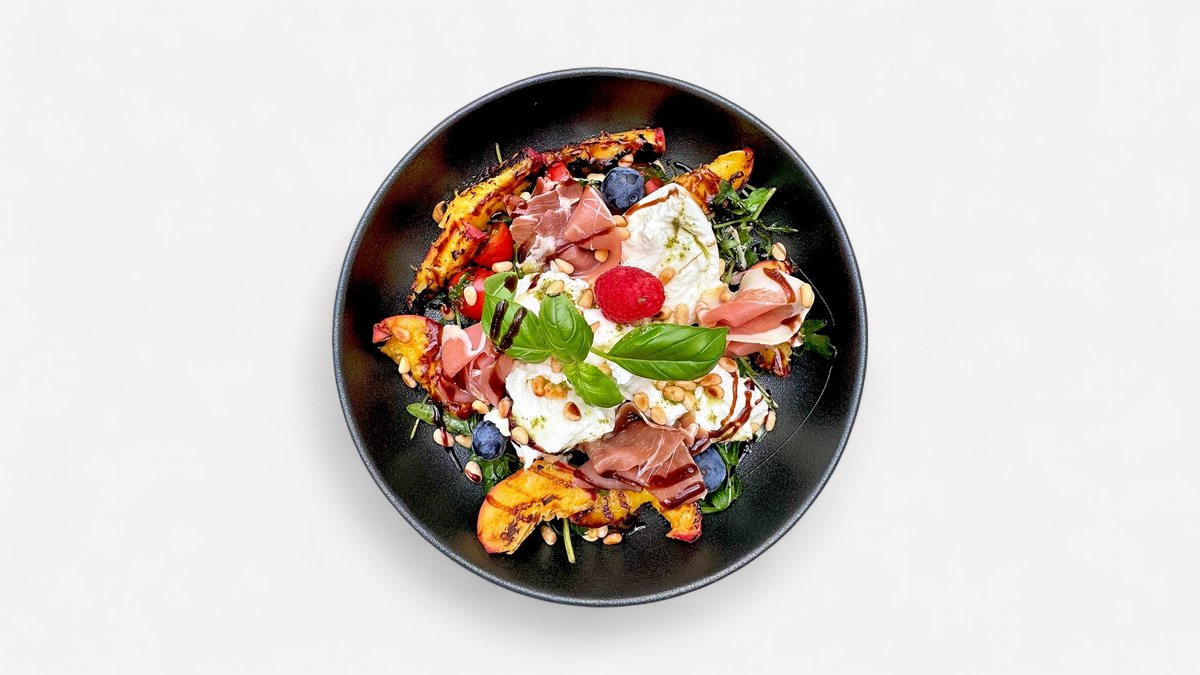 Krēmīgā Itālijas Burrata, grilēti persiki, Prosciutto, rukola, ķiršu tomāti, baziliks, balzamiko, bazilika pesto, grauzdēti rieksti