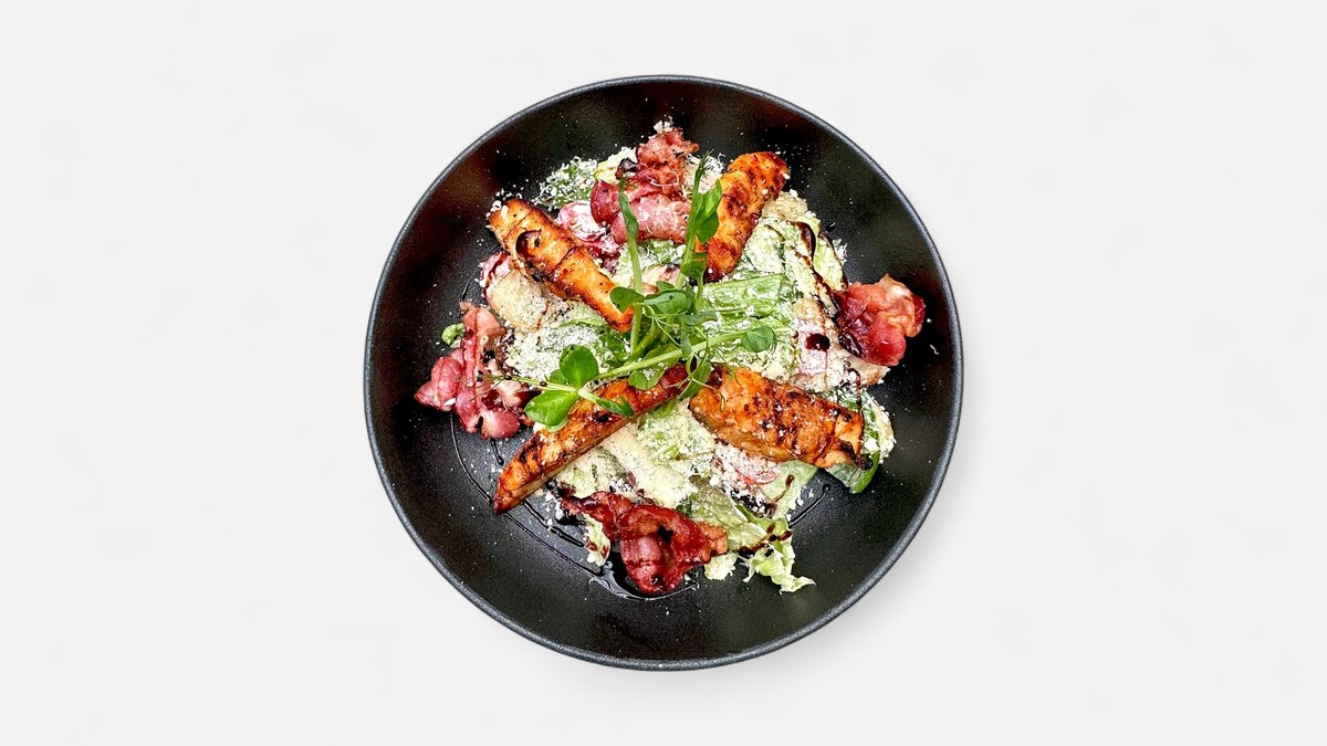 ķiploku aioli, Mozzarella, kartupeļi, melno trifeļu karpačo, Parmigiano Reggiano, Extra Virgin olīveļļa