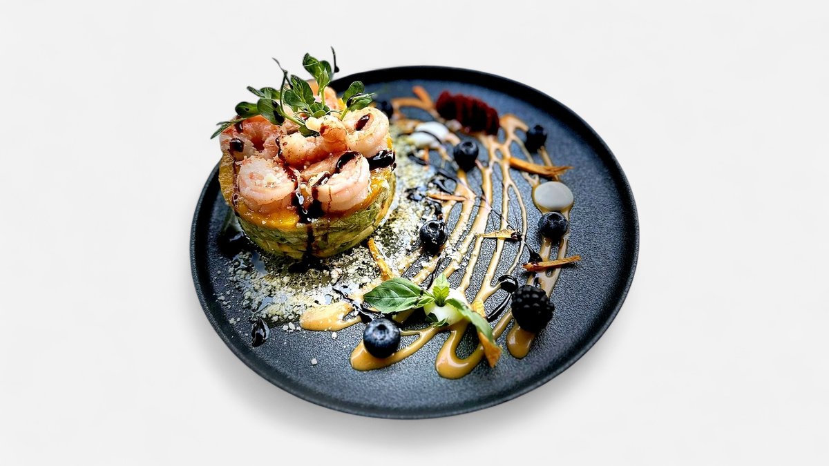 Mango, avokado, gurķis, tīģergarneles, bazilaka pesto, balazmiko