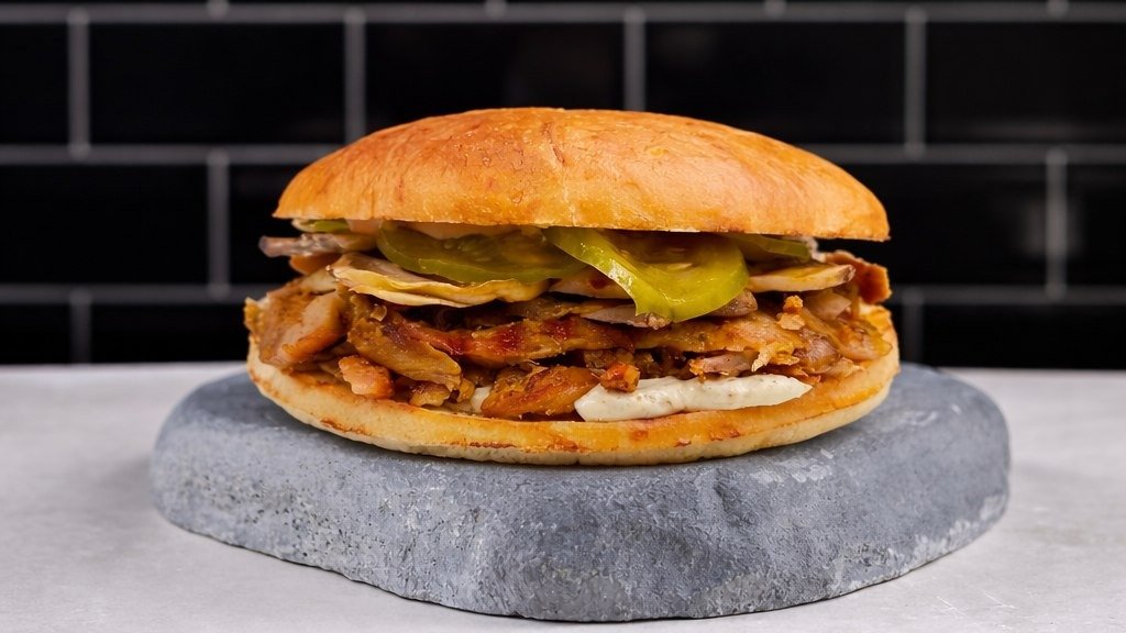 Pašgatavota Brioša bulciņa Sēņu mērce Vistas kebaba gaļa Cepti šampinjoni Marinēti gurķīši
