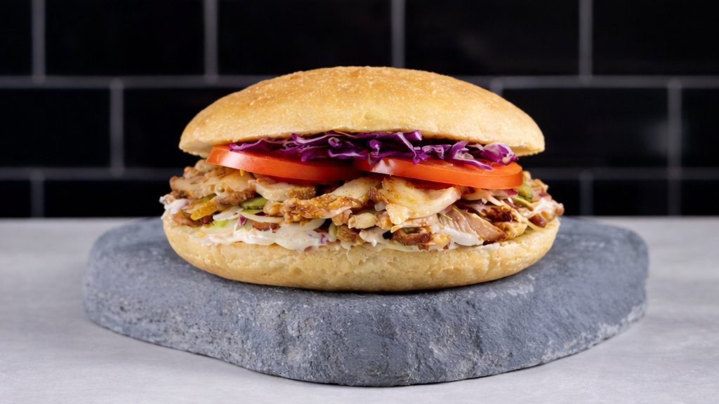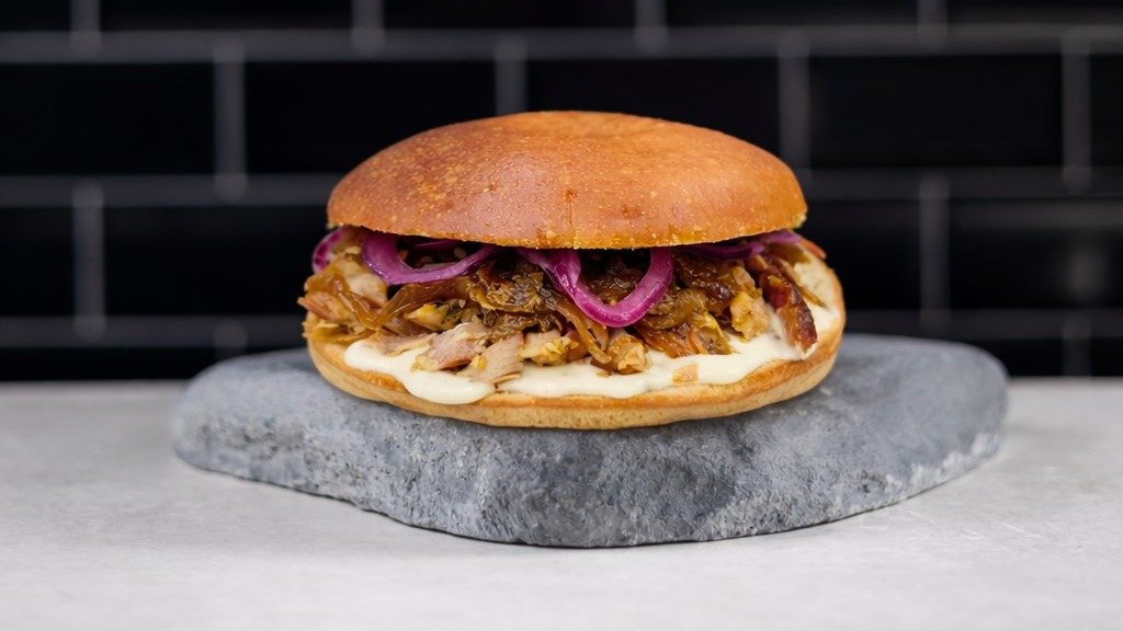 Pašgatavota Brioša bulciņa Sinepju un BBQ mērce Vistas kebaba gaļa Karamelizēti sīpoli Marinēti sarkanie sīpoli