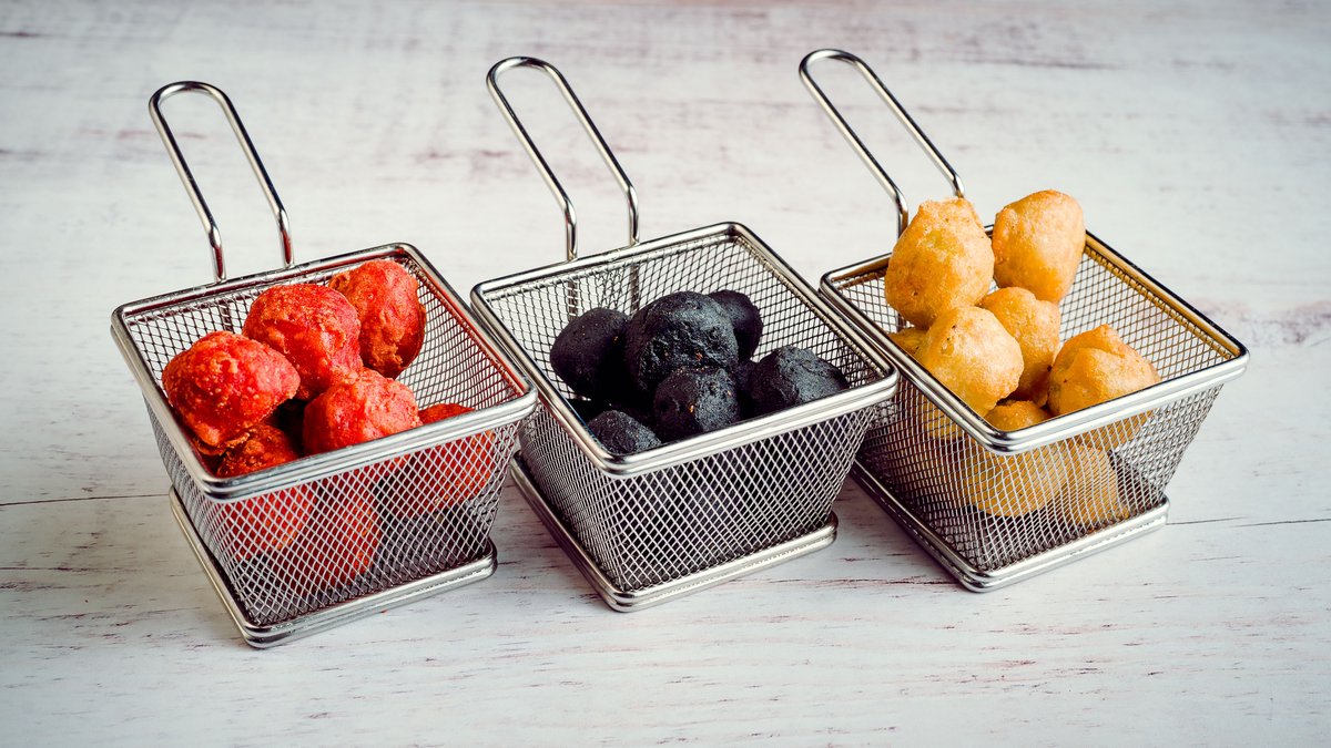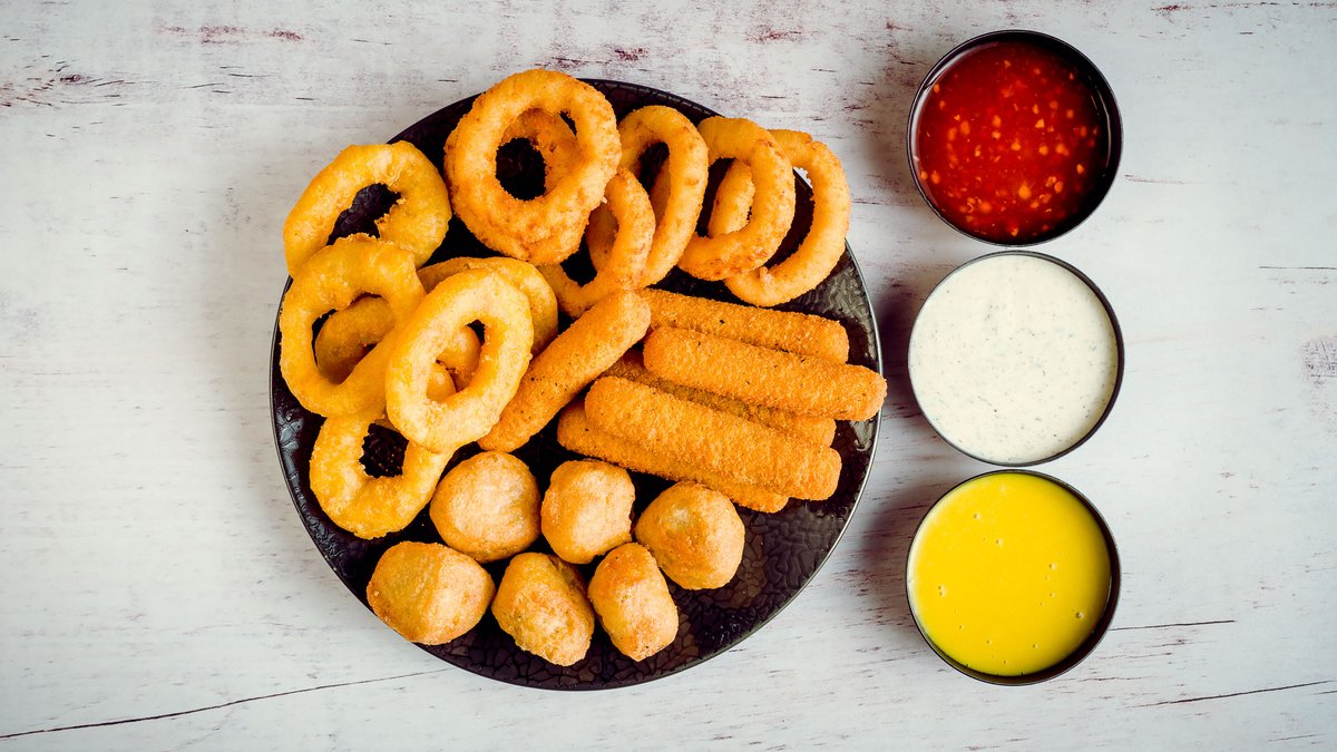 Mocarella nūjiņas 6gb., kalmāru un sīpolu gredzeni 6gb., čīllija čedara siera nageti 6gb., trīs mērces pēc izvēles.