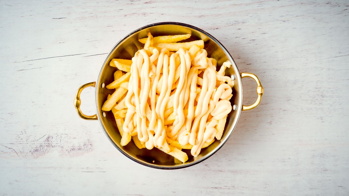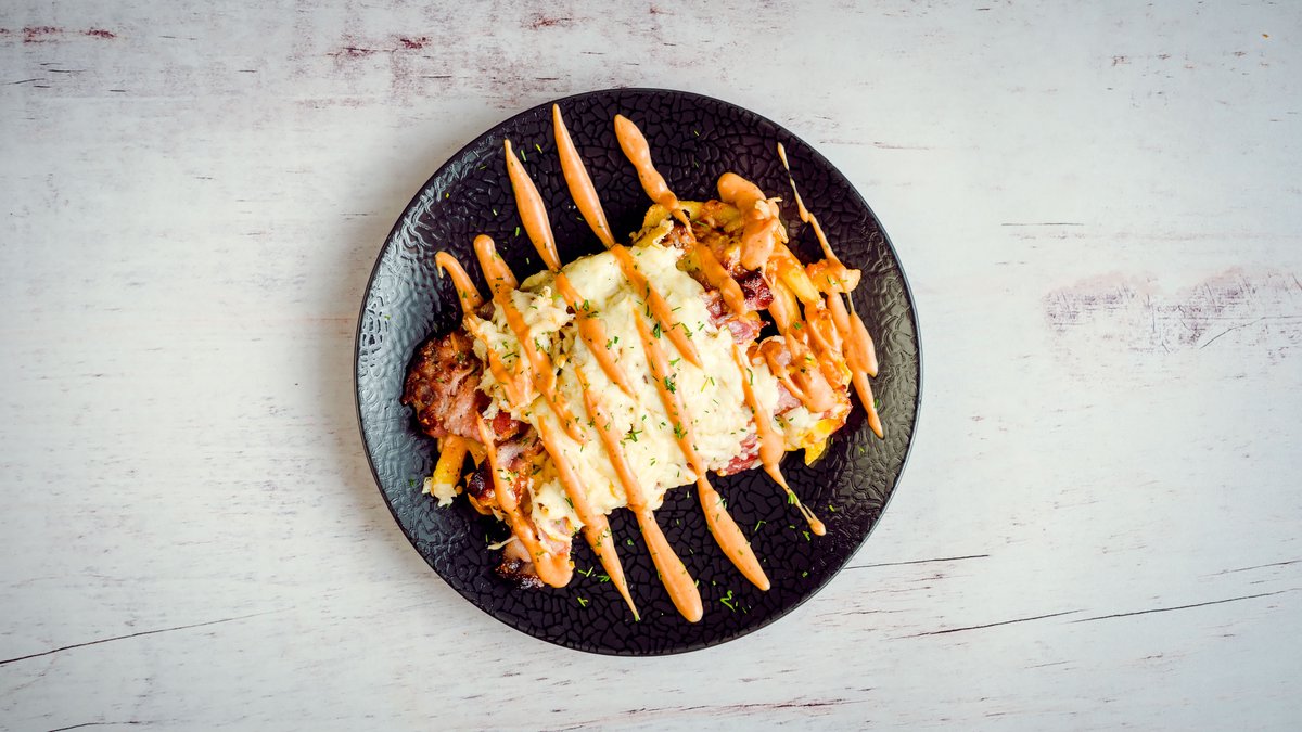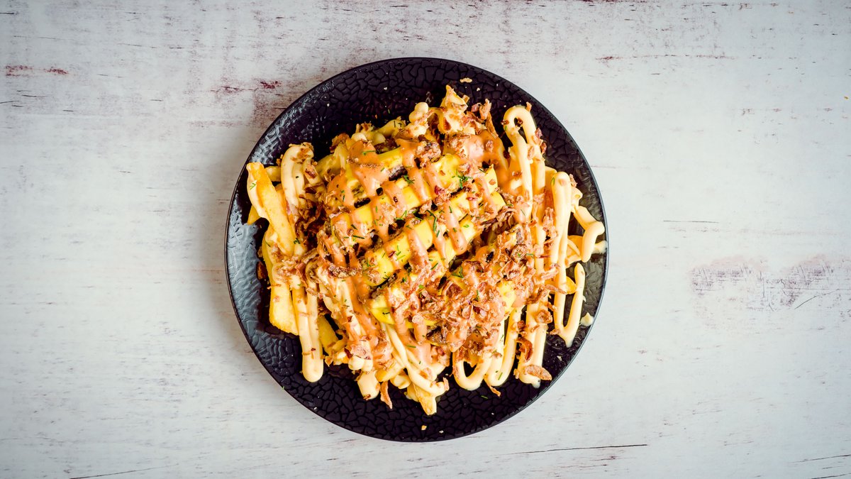 Frī kartupeļi, liellopu burger gaļa ar sieru, grauzdēti sīpoli, sieras-steika mērce, dilles