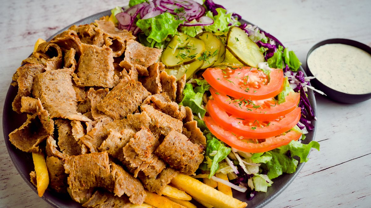 Jēra gaļa, tomāti, kaposti, marinēti gurķi, mērce pēc izvēles, sīpoli, lavašs vai pitas maize