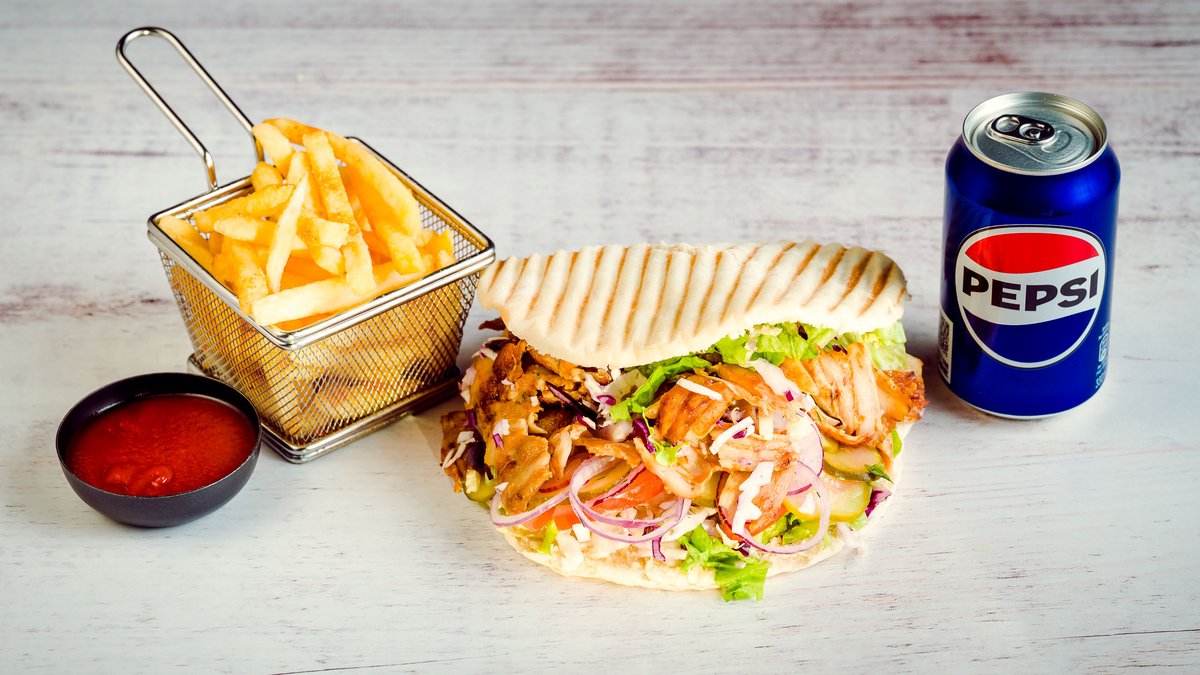 Kebabs pitas maizē, kartupeļi frī, mērce, dzēriens 330ml