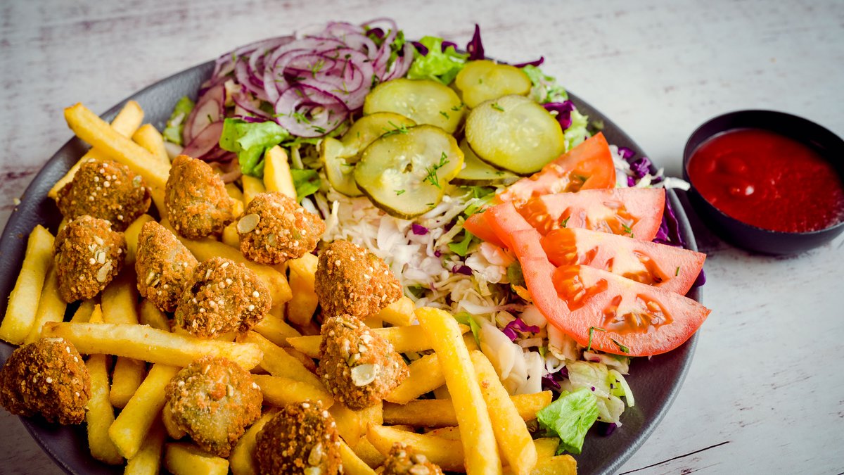 Gaļa, tomāti, marinēti ģurki, sīpoli, kaposti, mērce pēc izvēles, frī kartupeļi