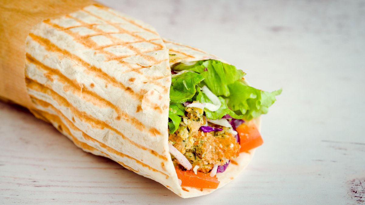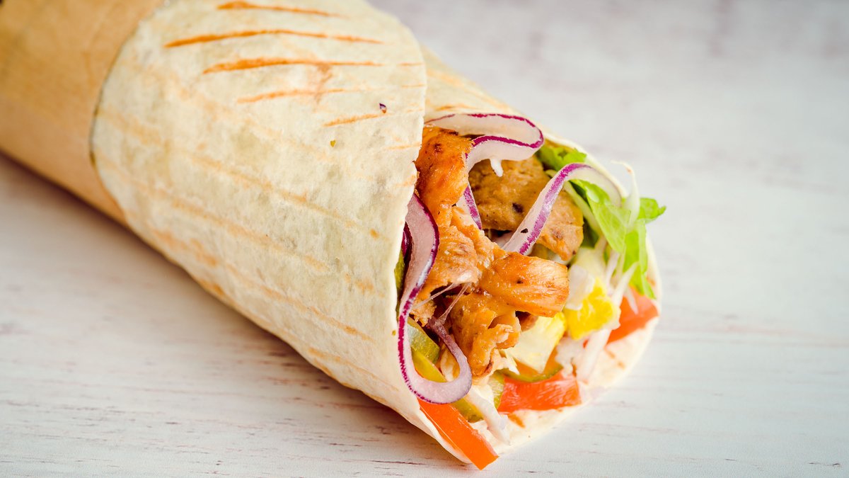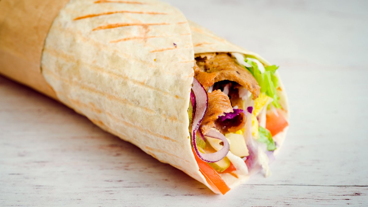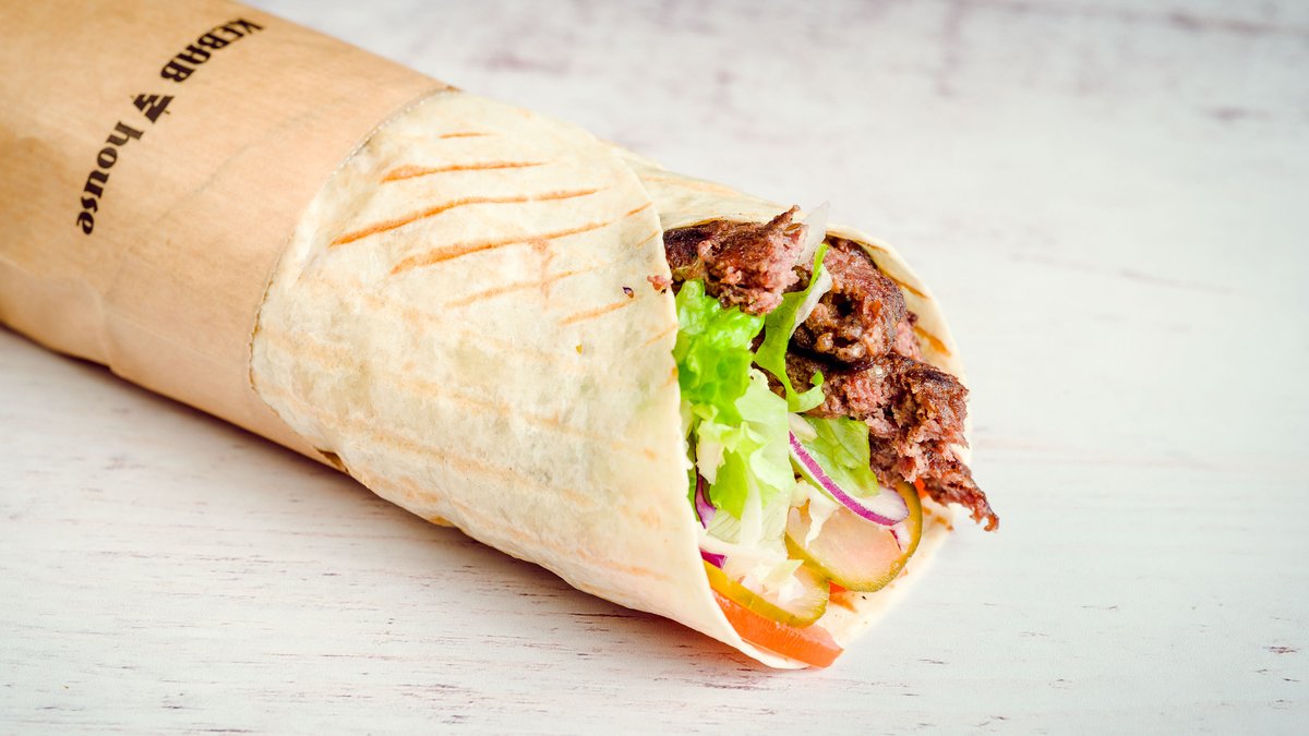 Gaļa, tomāti, marinēti ģurki, sīpoli, kaposti, mērce pēc izvēles, lavašs
