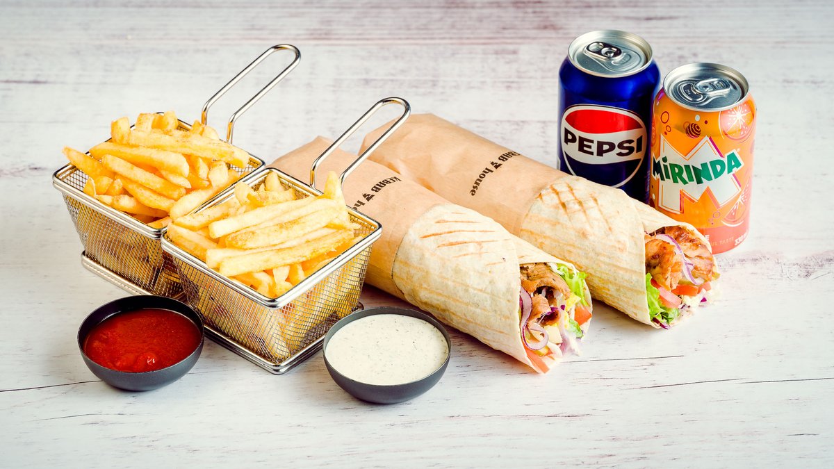 2X Vidējs kebabs, 2X kartupeļi frī, 2Xmērce, 2X dzēriens 330ml