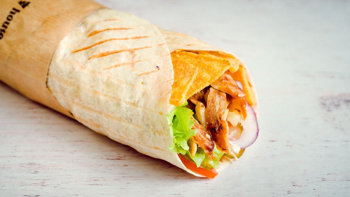 Gaļa, tomāti, marinēti ģurki, sīpoli, kaposti, asā mērce, chilli pārslas, viris chilli mērce, lavašs