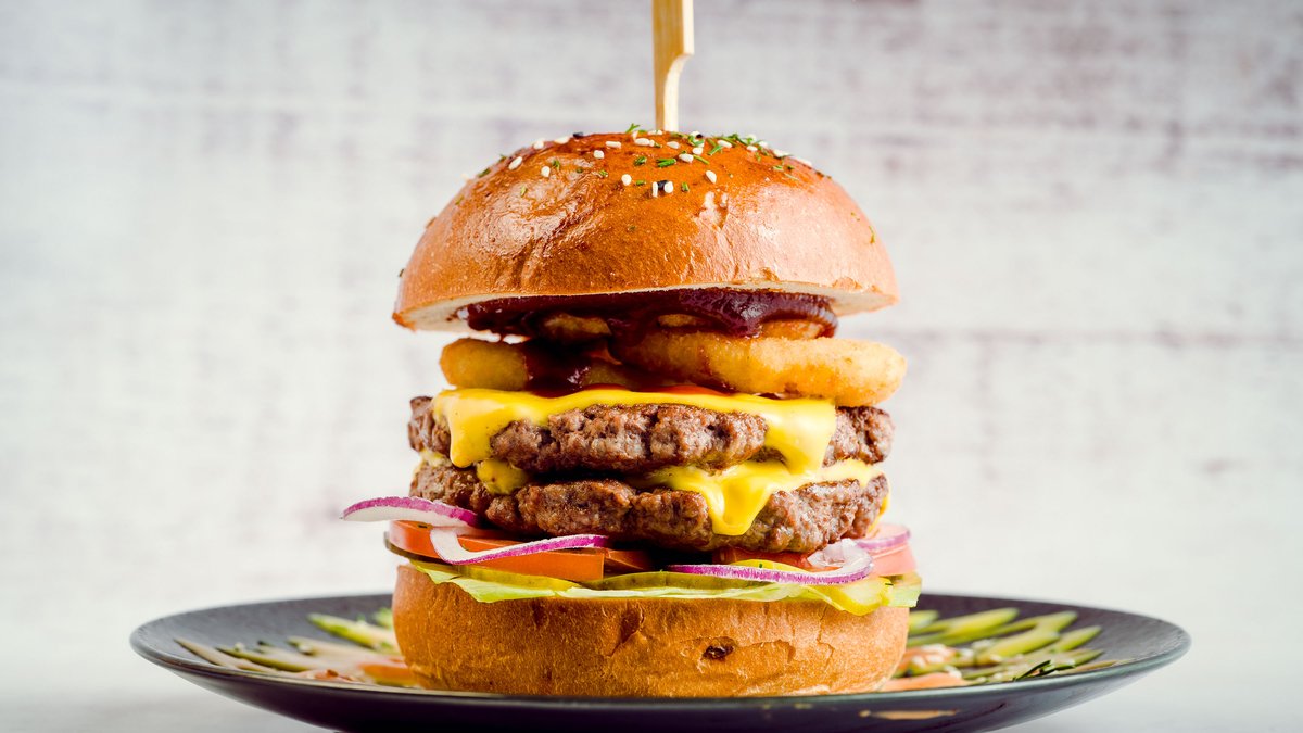 Divas liellopa gaļas kotletes, sīpoli, sīpoļu gredzeni, tomāti, siers, marinēti gurķi, iceberg salāti, BBQ mērce