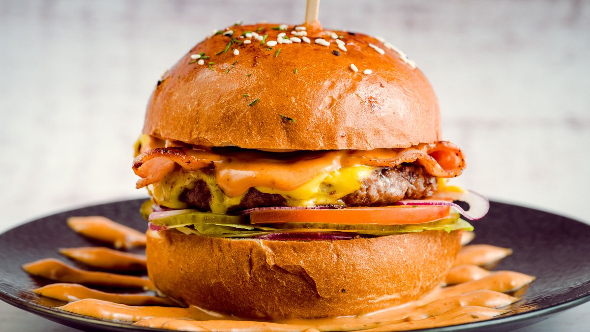 Liellopa kotlete, bekons, sīpoli, tomāti, siers, marinēti gurķi, iceberg salāti, steika mērce