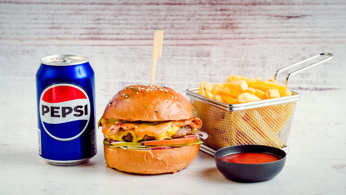 Burgeris, kartupeļi frī, mērce, dzēriens 330ml