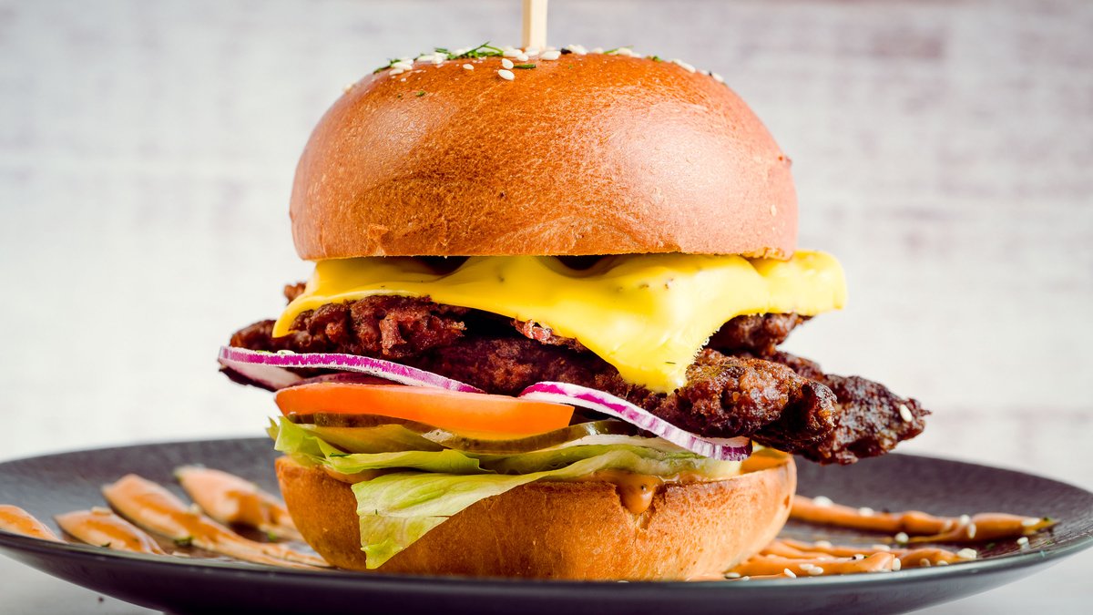Jēra gaļas kotlete, sīpoli, tomāti, siers, marinēti gurķi, iceberg salāti, steika mērce