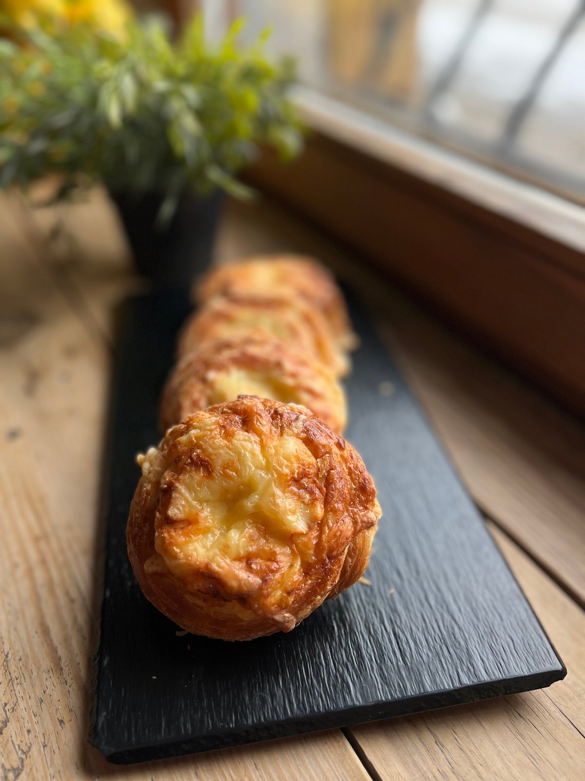 Īsts sviesta kruasāns, Sulīgs mandeļu krēma pildījums, kas gatavots no īstām mandelēm un īsta saldkrējuma sviesta, kraukšķīga garoziņa un mandeļu skaidiņas, pārkaisītas ar pūdercukuru, gadākais kruasāns rajonā