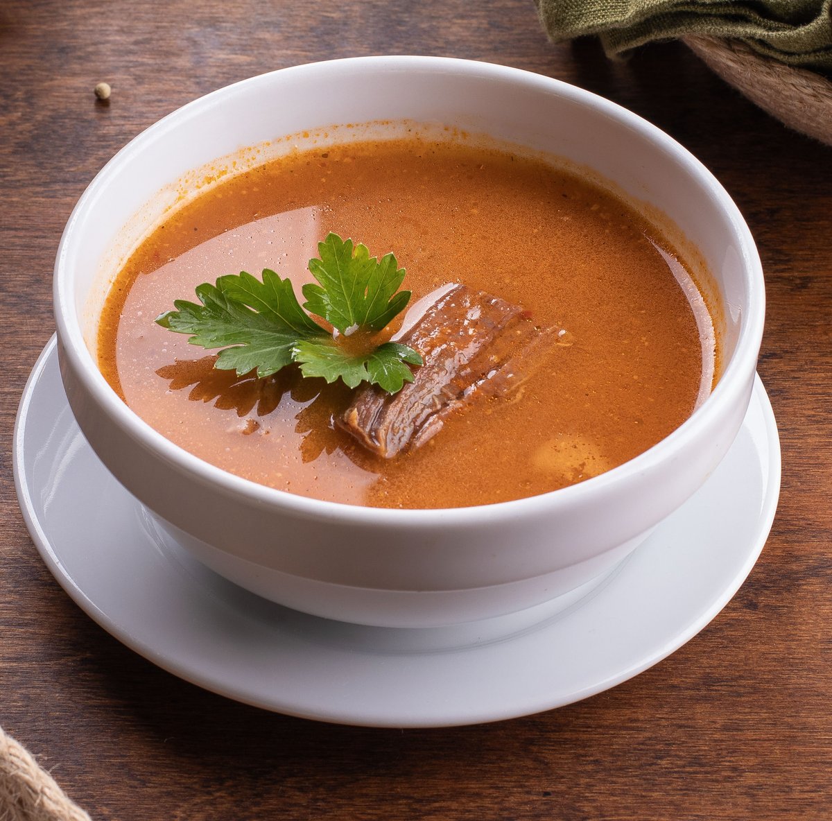 "Slavenā pikantā gruzīnu zupa ar ar liellopu gaļu, rīsiem un svaigu koriandru - 1 gab. (350 gr.)" "Знаменитый острый грузинский суп с говядиной, рисом и свежей кинзой - 1шт.(350г.)"