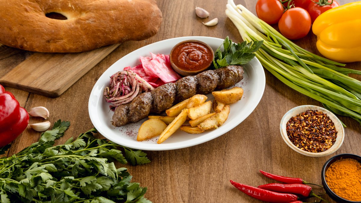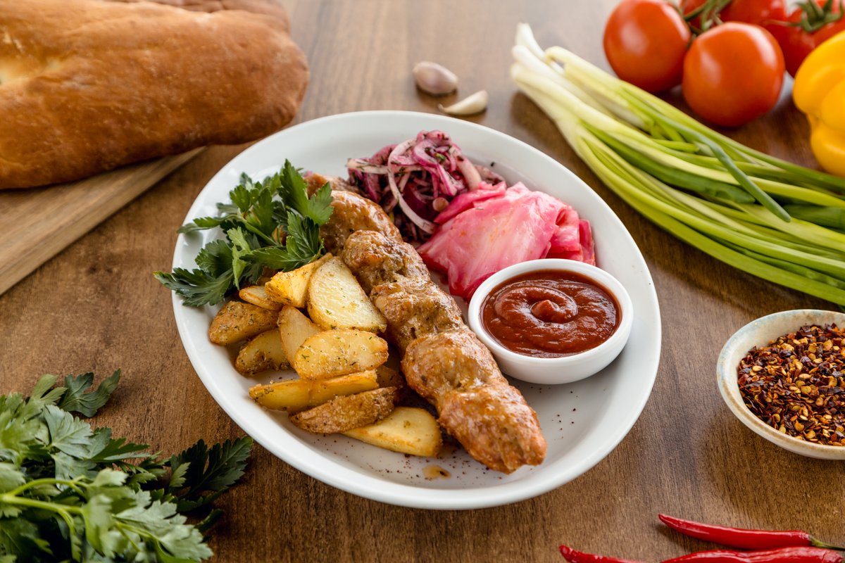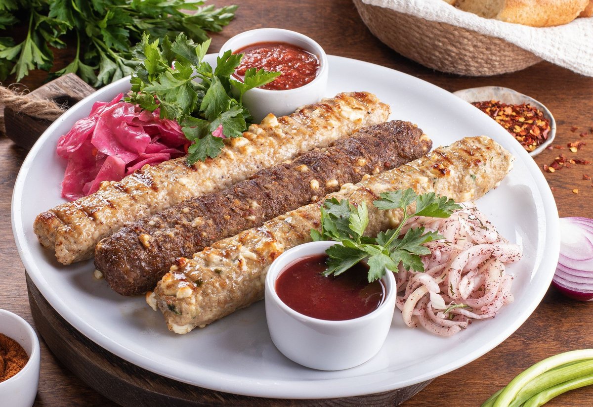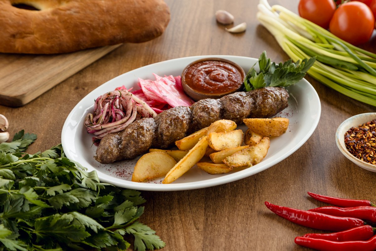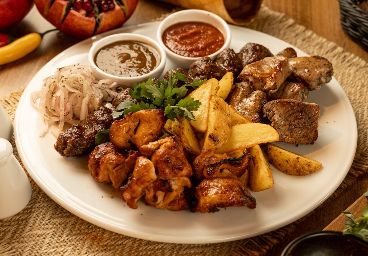 Liellopa luļa kebabs, cūkgaļas kakla kebabs un vistas kebabs ar lauku gamē kartupeļiem un marinētiem sīpoliem, ar sacebeli un tkemali mērcēm - 1 gab. (875 gr.) "Люля-кебаб из говядины, шашлык из свиной шеи и из курицы с картофелем по-деревенски и маринованным луком, с соусами сацебели и ткемали- 1 шт.(875г.)"