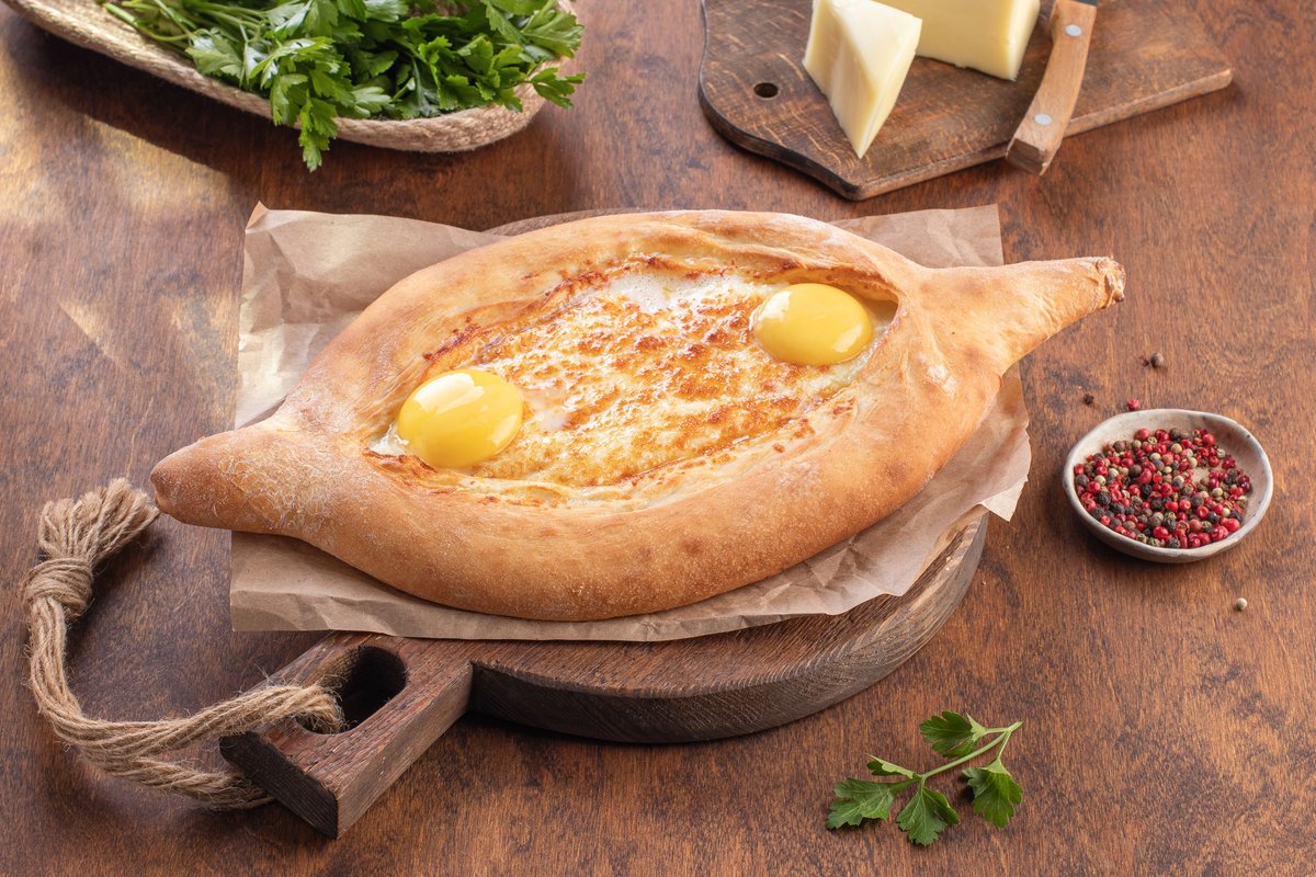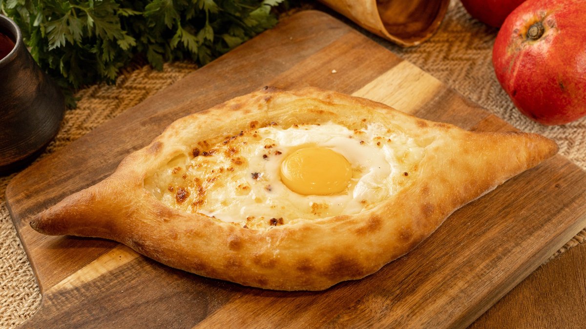 "Atvērti hačapuri “laivas” formā ar siera pildījumu, olu un sviestu / "Открытый хачапури в форме ""лодочки"" с сырной начинкой, яйцом и сливочным маслом.