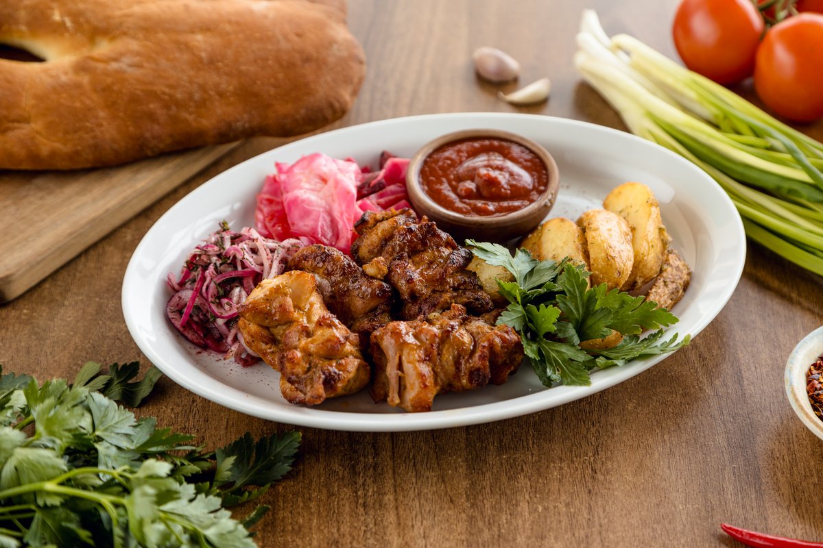 Liellopa, jēra un vistas gaļas kebabi, gurijāņu kāposti, marinēti sīpoli, sacebeli un tkemali mērces. Кебабы из говядины, из баранины и из курицы, капуста по-гурийски, маринованный лук, соусы сацебели и ткемали