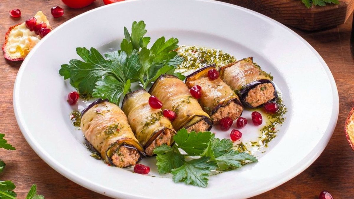 Apceptu baklažānu rullīši, pildīti ar pīkantu valriekstu pastu, sieru un ķiplokiem