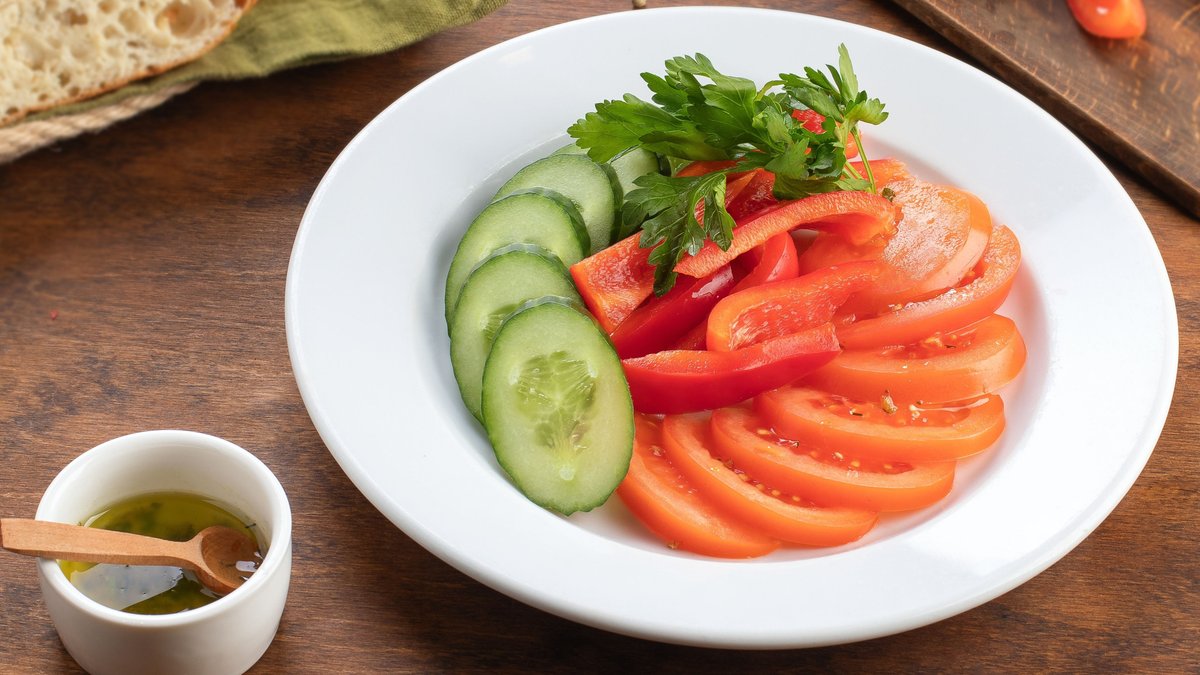 Svaigi saldie pipari , gurķi, tomāti, saulespuķu eļļa mērce ar koriandru