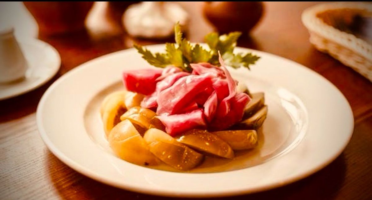 "Grilēti cūkgaļas kakla gabaliņi, pasniedz ar marinētiem sīpoliem un sacebeli mērci "Кусочки свиной шеи, жареной на гриле, подается с маринованным луком и соусом сацебели