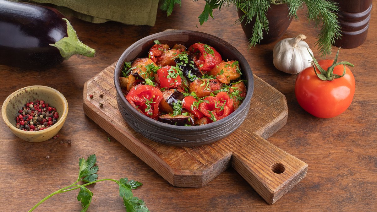 Baklažani, tomāti, sīpoli un paprika, cepti ar ķiplokiem, koriandru un sacebeli mērce