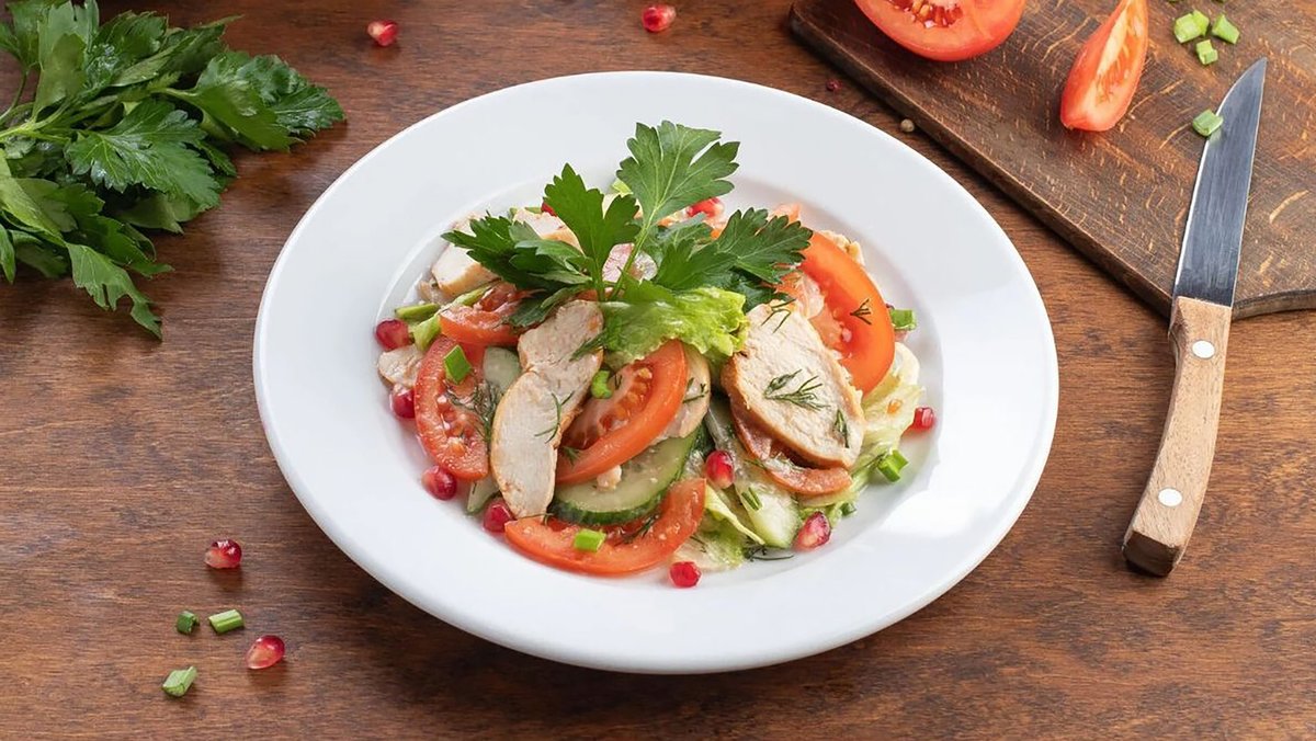 Svaigi tomāti, gurķi, zaļie sīpoli, cepta vistas fileja, granātābolu sēklas, pikanta mērce un pētērsīļi