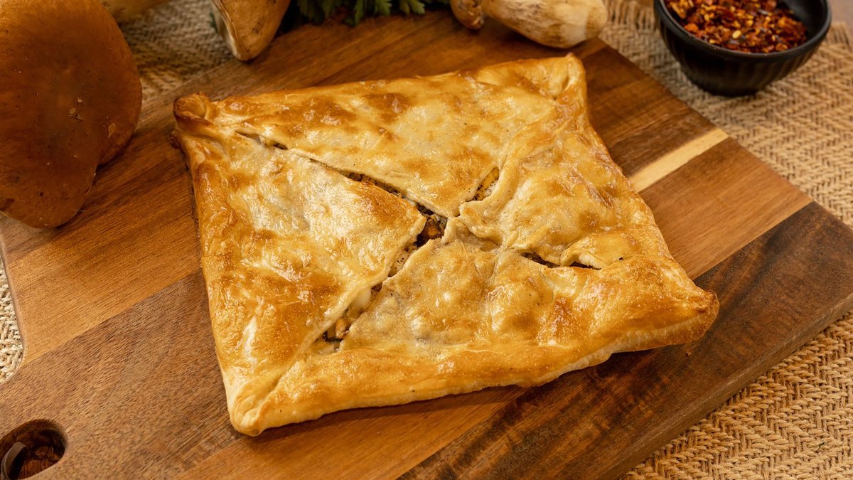 Hačapuri no kārtainās mīklas, pildīta ar spinātiem, baravikām, sieru un vārītu olu