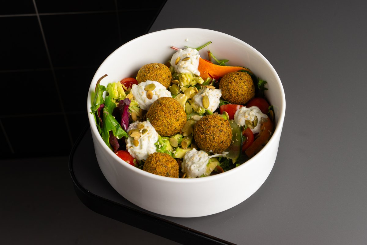 Falafeļa salāti ar ķiploka jogurta mērci, avokado, burkānu un gurķu strēmelēm, grauzdētām sēklām un grauzdētu kvinoju