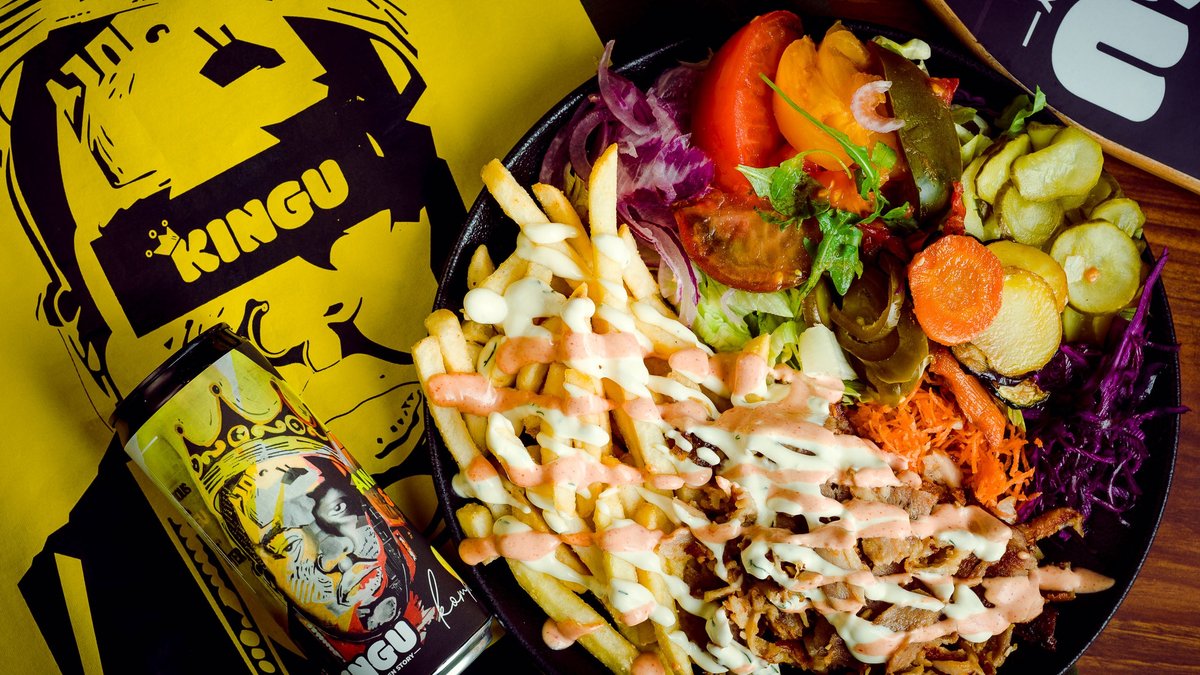 Kebab box ar frī kartupeļiem, mērci pēc izvēles un kādu no girosa gaļām