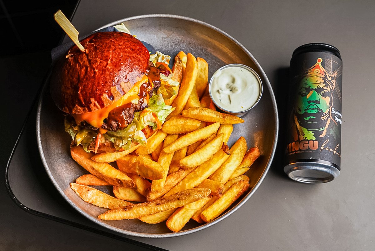 Burgers brioche maizītē ar dubultu, Latvijā audzētu liellopa gaļu, grauzdētiem sīpoliem, čedaras sieru, marinētiem gurķiem, svaigs sarkanais sīpols, svaigais salāts, BBQ un steika mērce, Burgeru mērce. Komplektā iekļauti frī kartupeļi un dzēriens pēc izvēles.