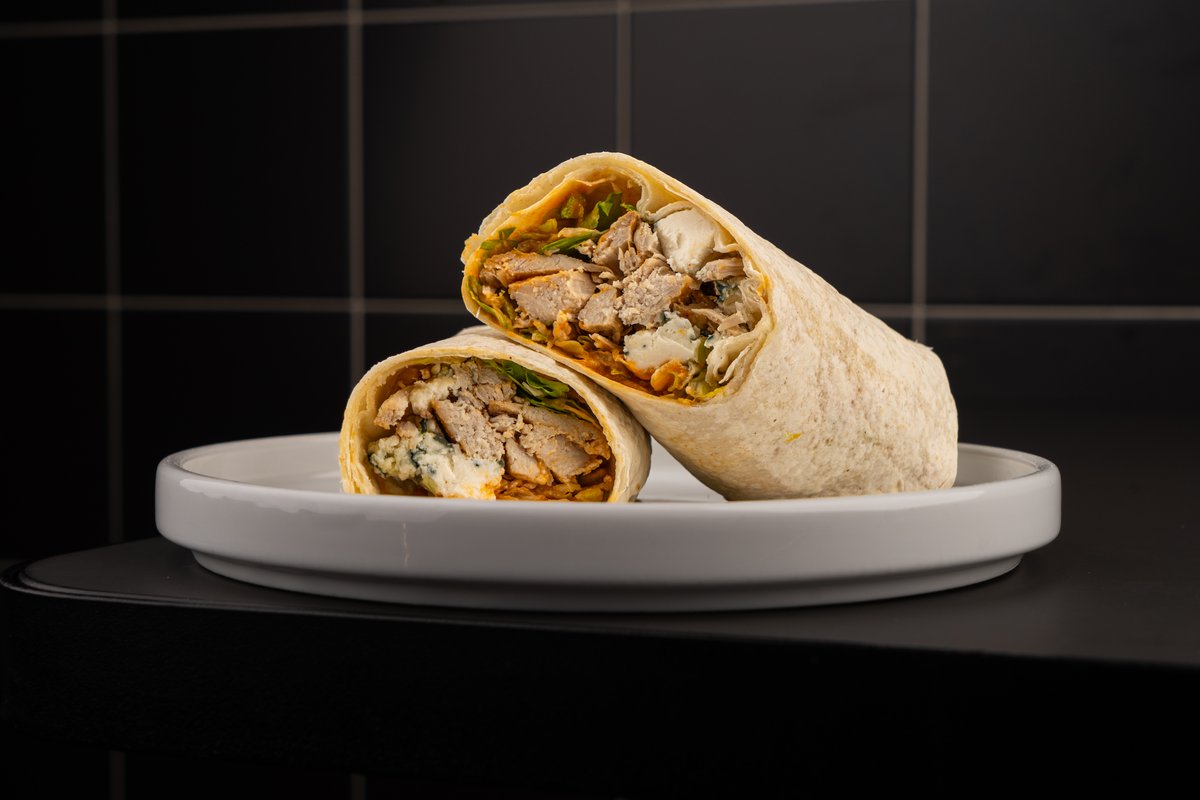 Burgers briošs maizītē ar burgera mērci, fritētu vistas krūtiņu asā Buffalo mērcē, svaigiem zaļajiem salātiem, čedaras sieru, zilo sieru, burgera un zilā siera mērci