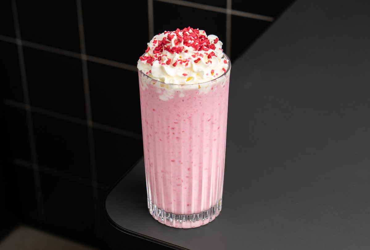 Krēmīgs aveņu un kokosriekstu piena kokteilis ar saldējumu, vaniļas sīrupu un aveņu kordiali. Pasniegts ar putukrējumu un rozā kristālu akcentiem