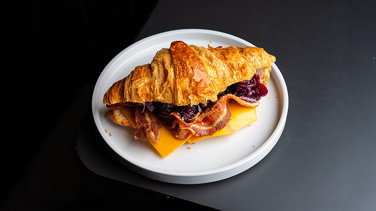 Burgers brioche maizītē ar dubultu, Latvijā audzētu liellopa gaļu, grauzdētiem sīpoliem, čedaras sieru, marinētiem gurķiem, svaigs sarkanais sīpols, svaigais salāts, bekons, karamelizēti sīpoli, sinepju BBQ un burgeru mērci