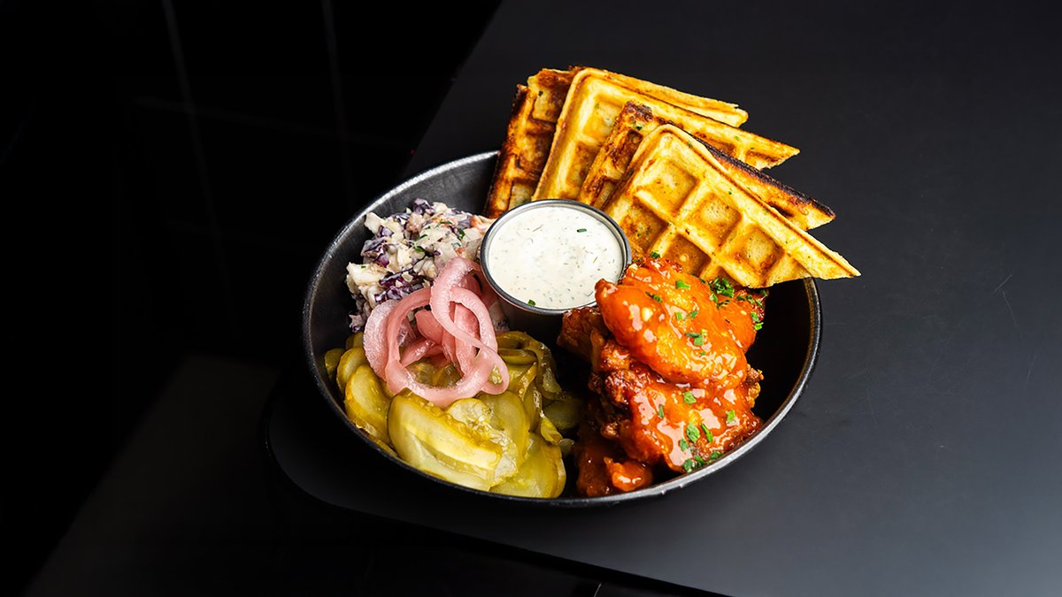 Crunchy vista ar čedara vafelēm Kraukšķīgi panēta vistas krūtiņa, pasniegta kopā ar siltām čedara siera un maurloku vafelēm. Ēdiens pasniegts kopā ar svaigiem coleslaw kāpostu salātiem, marinētiem sīpoliem un gurķiem, kā arī tiek pievienota krēmīga zaļumu rančo mērce Vistas krūtiņu iespējams izvēlēties arī asā Nashville Hot mērcē ar kajenas pipariem vai asā sviesta Buffalo mērcē