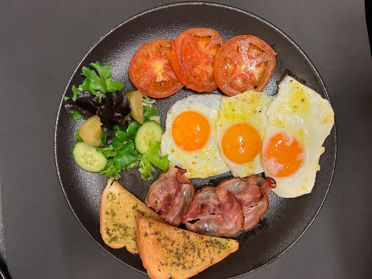 Sātigais liellopa burgers ar tomāti,bekonu,olu,sinepju mērci,