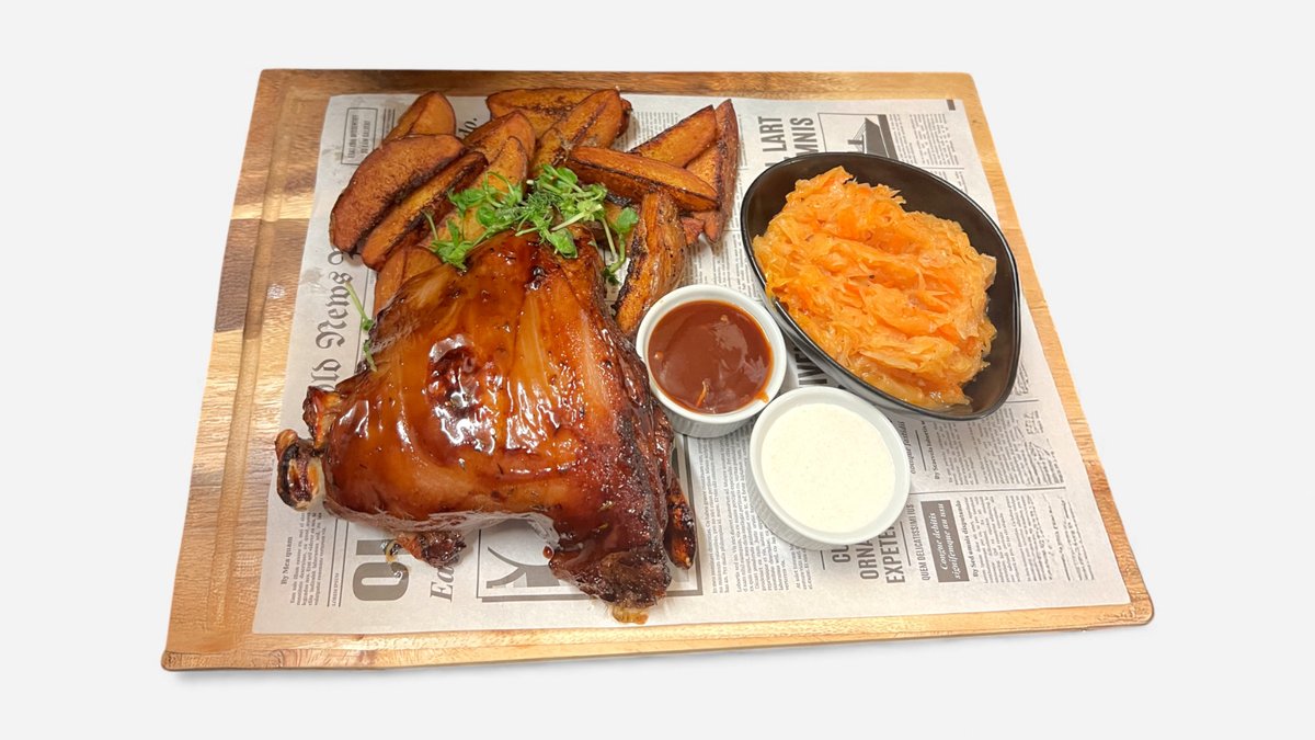 Cūkas čingulis,pasniegts ar apceptiem lartupeliem,štovētoem kāpostiem un mārrutkiem