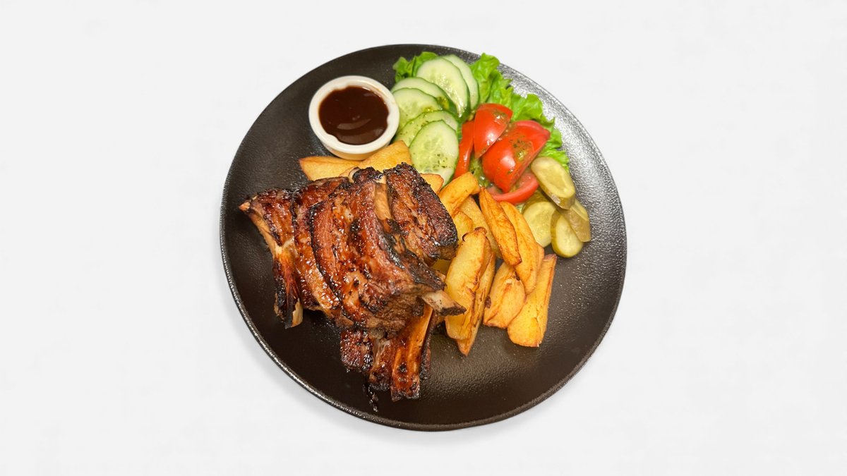 Cūkgaļas ribiņas,pasniegtas ar apceptiem kartupeliem un paštaisitu mērci