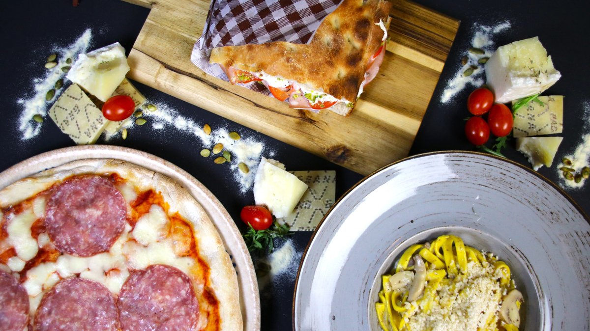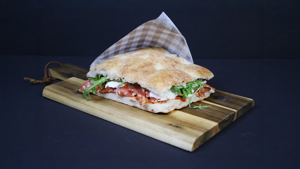 Foccacia maize, Calabreses krēms, Spianata Piccante, Mozzarella di Bufala, rukola