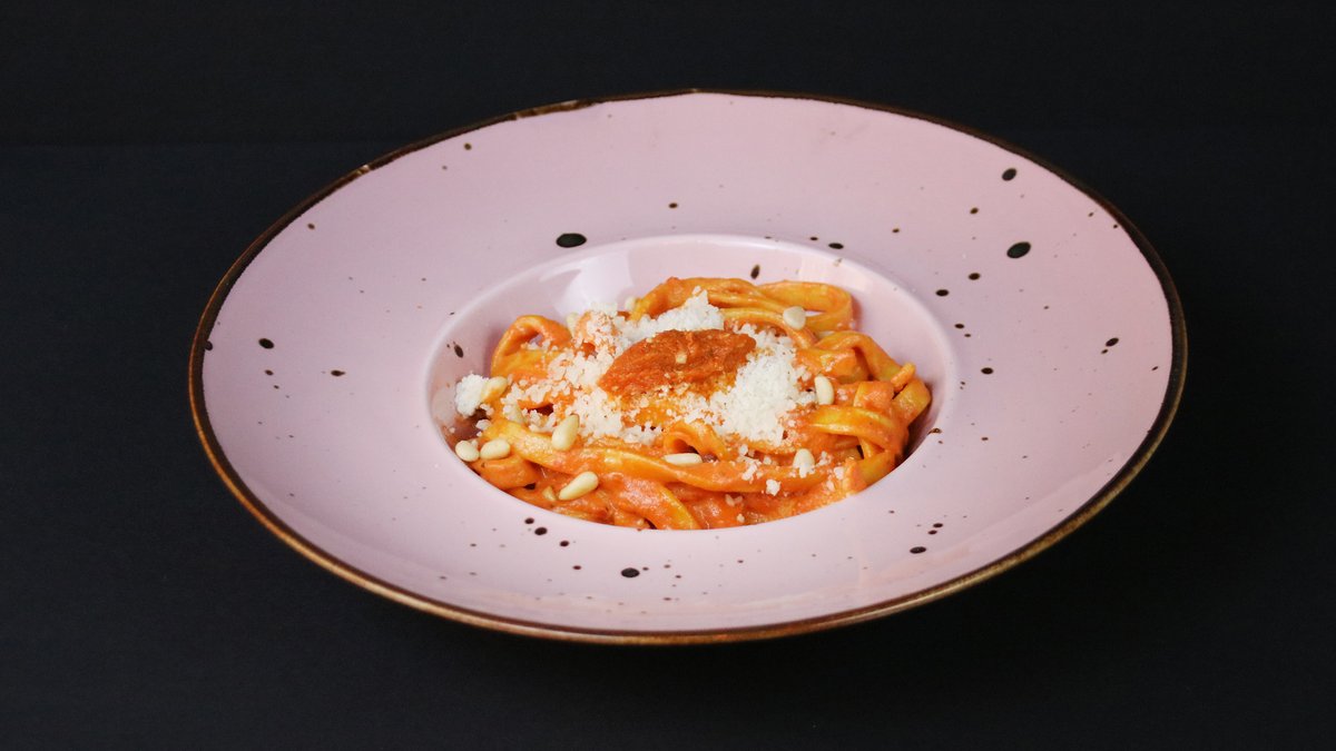 Tagliatelle ar kaltētu tomātu pesto, parmezāna sieru un ciedru riekstiem