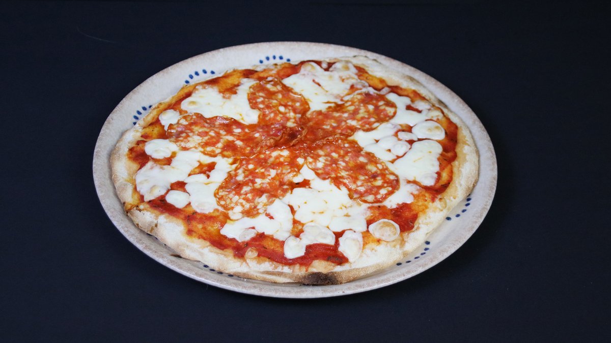 1+1 Diavola - Salami Piccante, Mozzarella Fior di Late, picas mērce, bazilika olīveļļa