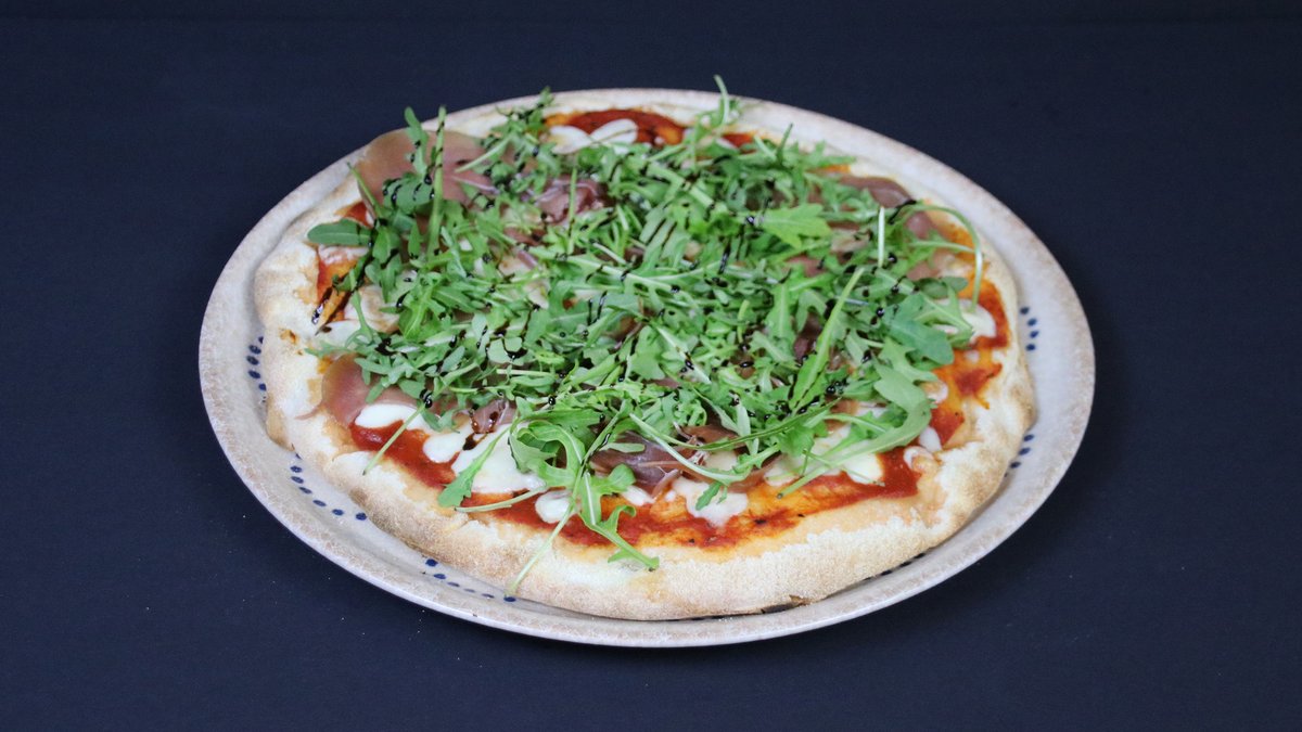 Prosciutto Crudo, rukola, balzamiko krēms, Mozzarella Fior di Late, picas mērce, bazilika olīveļļa