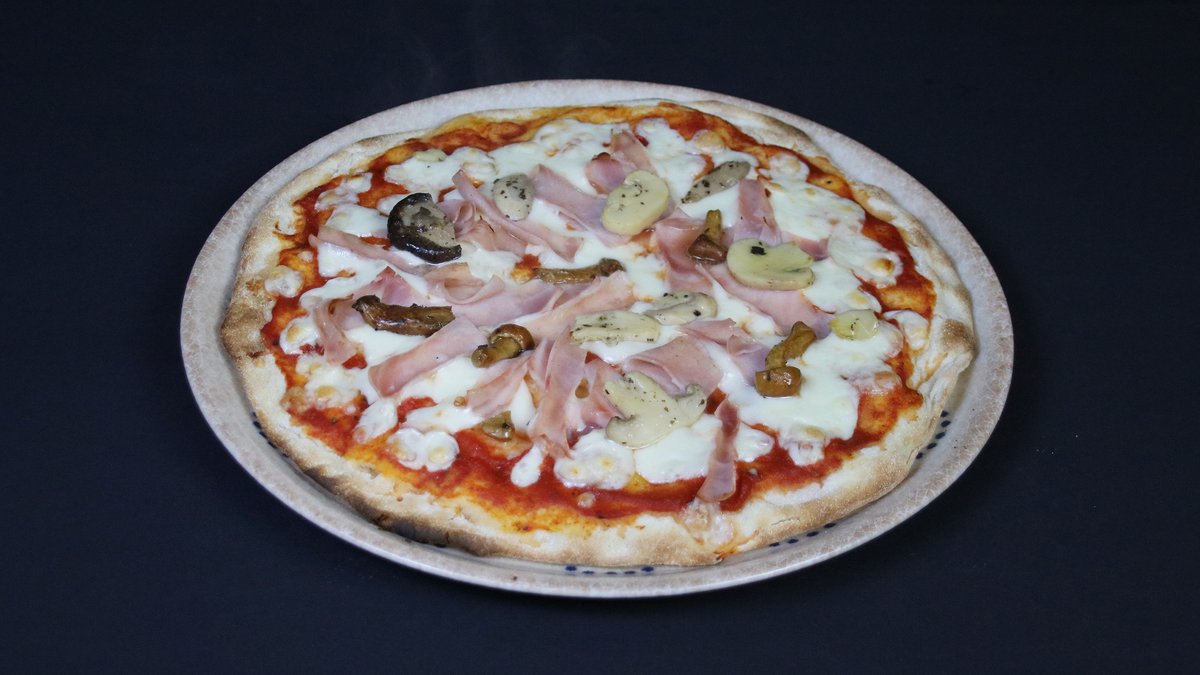 Prosciutto Cotto, sēnes, Mozzarella Fior di Late, picas mērce, bazilika olīveļļa