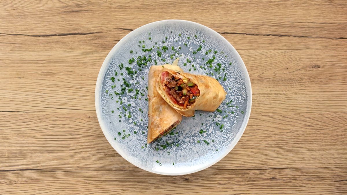 Liellopa wrap ar dārzeņiem, sieru, salātlapām un bbq mērci. Attēli ir orientējoši un tikai ilustratīviem nolūkiem. Iepakojums ir iekļauts ēdiena cenā.